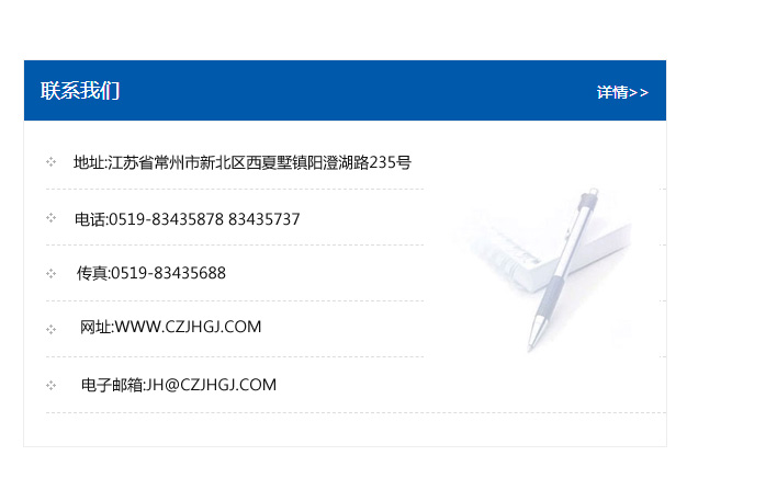 地址:常州市新北區友邦商務大廈1幢16、17層  電話:0519-85101652  傳真:0519-85112595  郵編:213022  網址:www.cz-jiayue_cn.jypem.com  郵箱:xiajifengaa@163.com